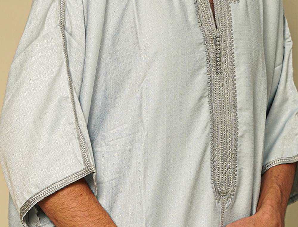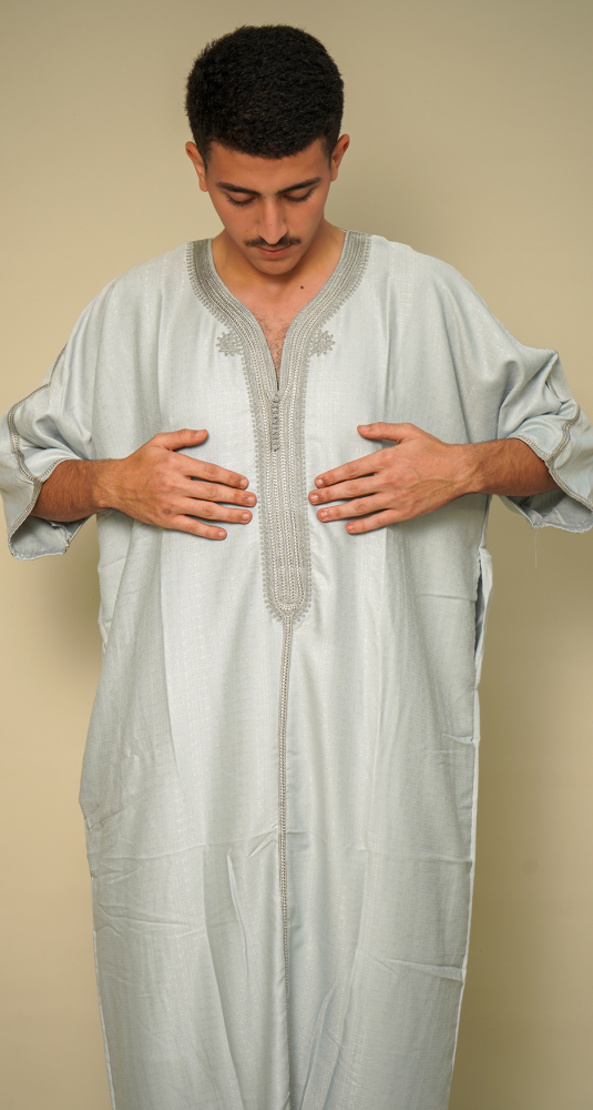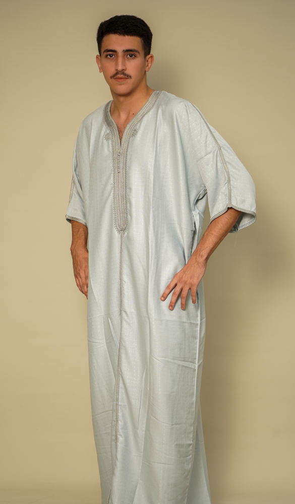 تألق بإطلالة تجمع بين التراث والأناقة مع لباس تقليدي للرجال مغربي بتصميم قندورة ذبابة بكم قصير بلون رمادي فاتح. مثالية للأجواء الصيفية، مصنوعة من قطن كشميري 100% يضمن الراحة والنعومة، مع لمسات تصميم كلاسيكية تضيف لمظهرك تميزاً وأصالة.